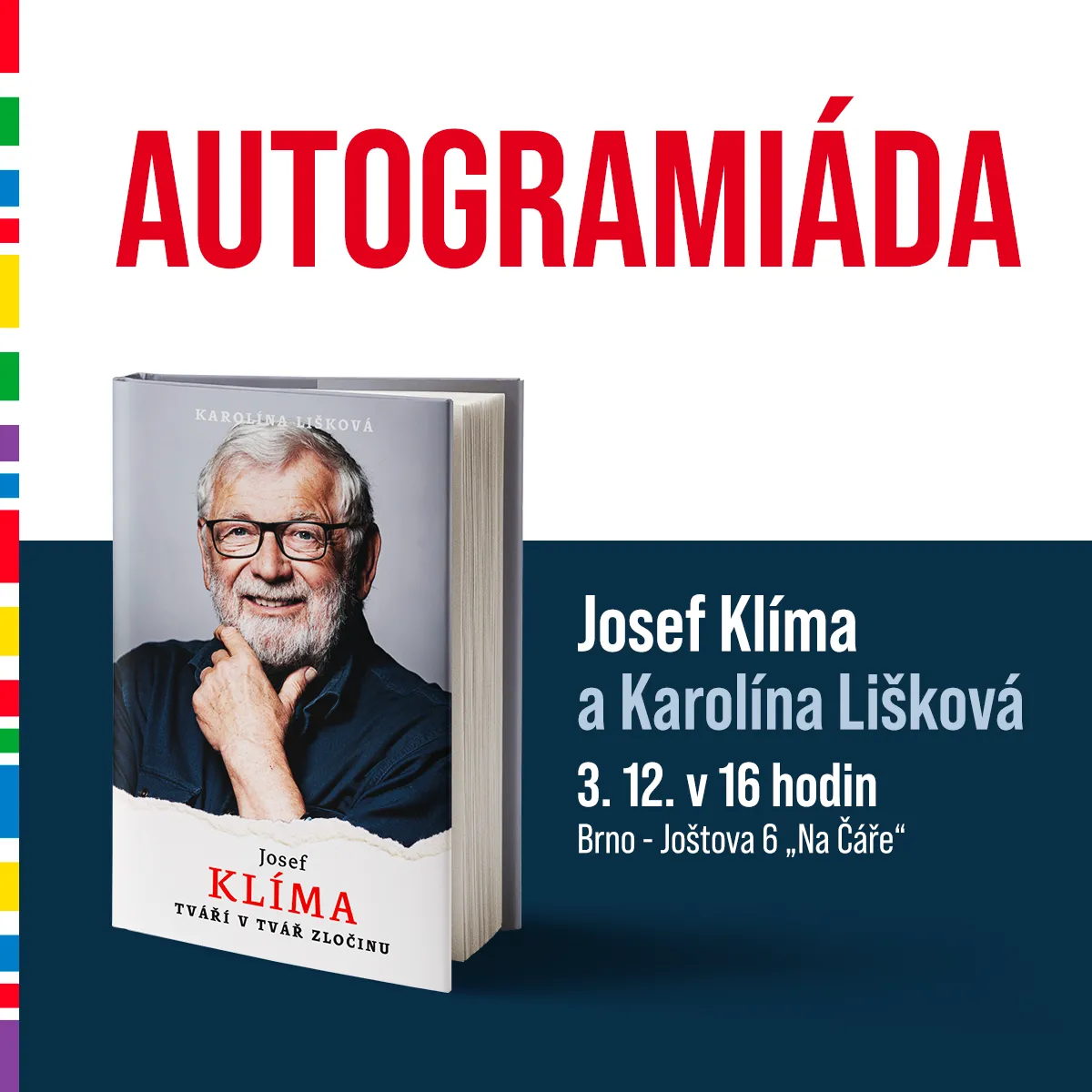 Srdečně vás zveme na autogramiádu Josefa Klímy a Karolíny Liškové k příležitosti vydání jejich společného knižního rozhovoru Josef Klíma: Tváří v tvář zločinu.