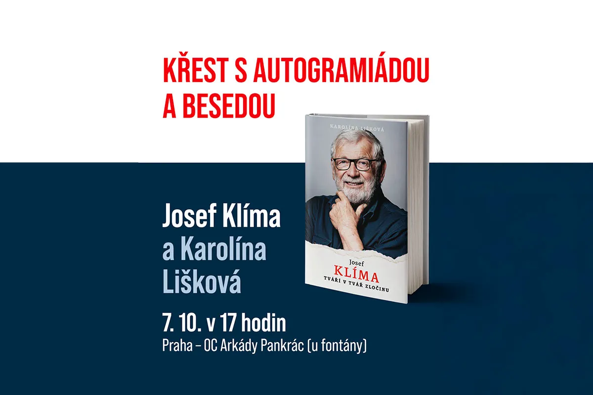 Srdečně vás zveme na křest knižního rozhovoru Josef Klíma: Tváří v tvář zločinu spojného s autogramiádou a besedou Karolíny Liškové a Josefa Klímy.