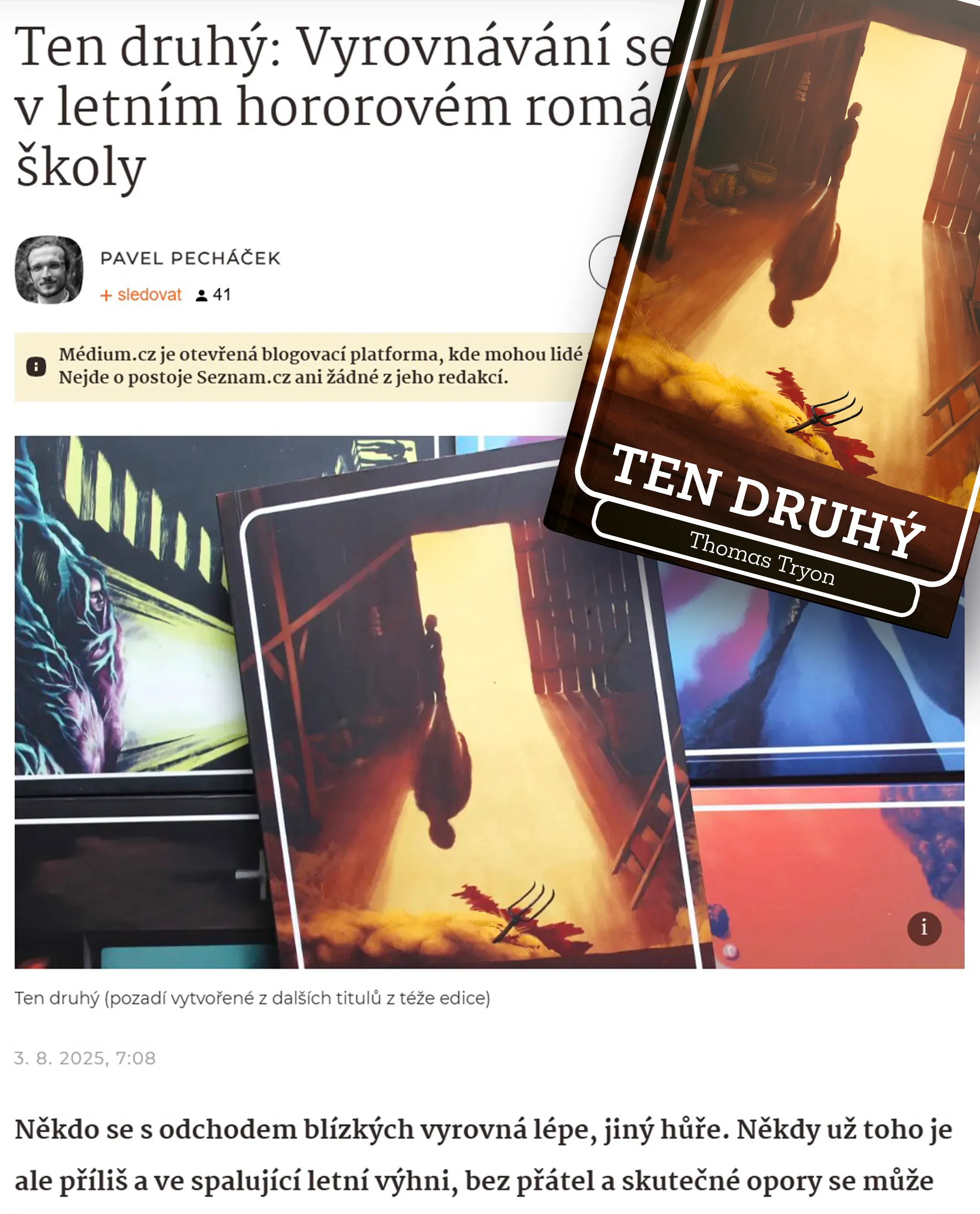 Horor Ten druhý je jen jeden z několika děl herce 50. a 60. let Thomase Tryona. Zapsal se však do paměti čtenářů nejvíce, jelikož byl zfilmován nedlouho po vydání v roce 1971. Horor Ten druhý, zasazený do léta na venkově ve 30. letech, pojednává o dvojčatech Nilesovi a Hollandovi, kteří jsou povahově tak odlišní, jak jen to jde. Jeden hodný a soucitný, druhý krutý ničema. Tajemná atmosféra okolo smrti jejich otce a dalších rodinných příslušníků mrazí i v létě. Co na knihu říká Pavel Pecháček ve své recenzi?